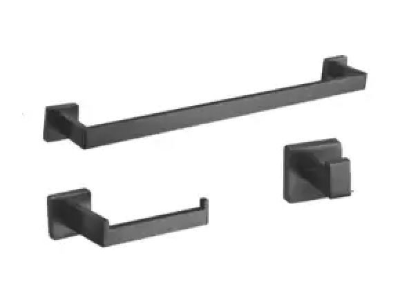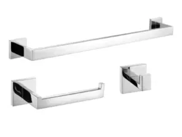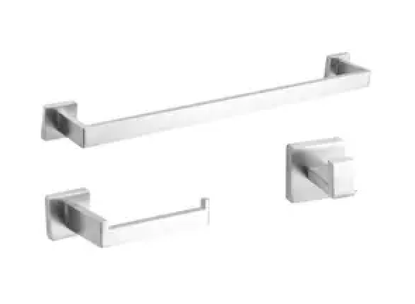 Square design. High-quality stainless steel set includes towel bar, hand towel bar, and robe hook.